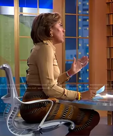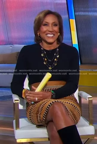Robin Roberts on Good Morning America on ABC was spotted wearing this beige blouse and brown striped skirt on Good Morning America on Feb 07 2024's episode. Robin's Skirt is the Striped Knit Pencil Skirt by Burberry Prorsum.