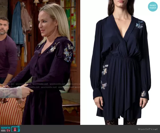 Sharon Newman (played by Sharon Case) on The Young and the Restless on CBS was spotted wearing this navy dress with floral rhinestones on The Young and the Restless on May 12 2022's episode. Sharon's Dress is the Remember Beaded Floral Long Sleeve Dress by Zadig & Voltaire.