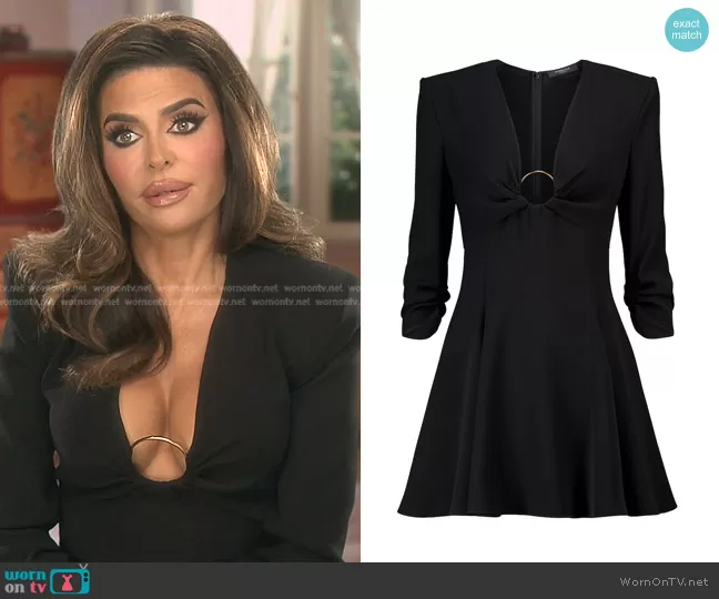 Lisa Rinna on The Real Housewives of Beverly Hills on Bravo was spotted wearing this black o-ring plunge neck dress on The Real Housewives of Beverly Hills on episode 'The Break-in' (12x01) in May 2022. Lisa's Dress is the O-ring Flared Satin Dress by Versace.