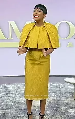 Tamron Hall on Tamron Hall Show on ABC was spotted wearing this gold cape top and skirt on Tamron Hall Show on May 12 2022's episode. Tamron's Top is the Viola floral-cloque cropped cape by Emilia Wickstead . Tamron's Skirt is the Viola Floral-cloque skirt by Emilia Wickstead.