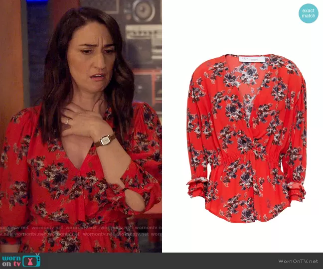 Dawn Solano (played by Sara Bareilles) on Girls5eva on Peacock was spotted wearing this red floral blouse on Girls5eva on episode 'Can't Wait 2 Wait' (2x04) in May 2022. Dawn's Top is the Posti Floral Blouse by IRO.