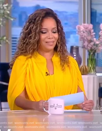 Sunny Hostin on The View on ABC was spotted wearing this yellow gathered maxi dress on The View on May 13 2022's episode. Sunny's Dress is the Pleated jersey maxi dress by Proenza Schouler.