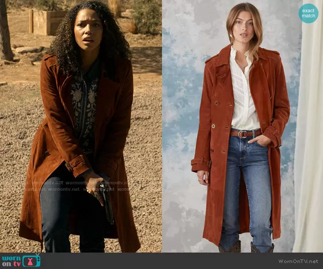 Cassie Dewell (played by Kylie Bunbury) on Big Sky on ABC was spotted wearing this suede trench coat on Big Sky on episode 'Family Matters' (2x17) in May 2022. Cassie's Coat is the Araminta Suede Coat by Sundance.