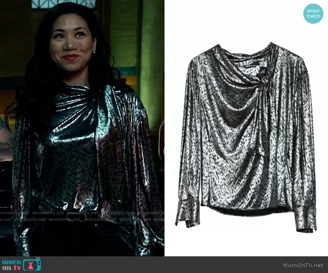 Melody Bayani (played by Liza Lapira) on The Equalizer on CBS was spotted wearing this draped metallic blouse on The Equalizer on episode 'Exposed' (2x18) in May 2022. Mel's Top is the Lavaliere Blouse by Isabel Marant.