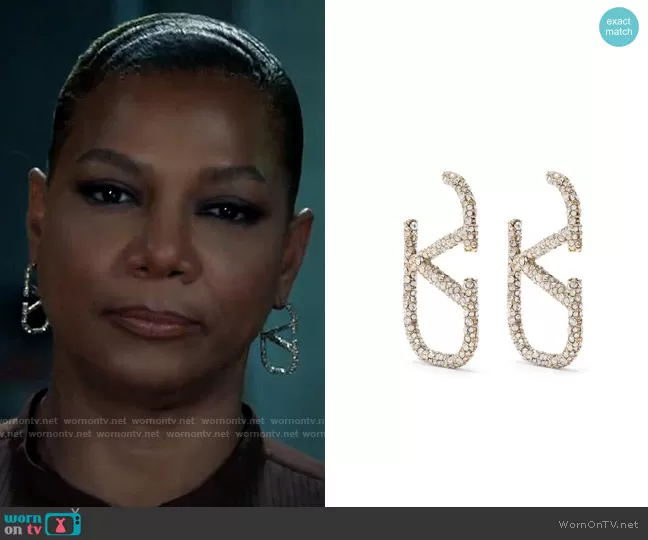 Robyn McCall (played by Queen Latifah) on The Equalizer on CBS was spotted wearing this V hoop earrings on The Equalizer on episode 'Exposed' (2x18) in May 2022. Robyn's Earrings is the Rhinestone-embellished VLOGO Earrings by Valentino Garavani.