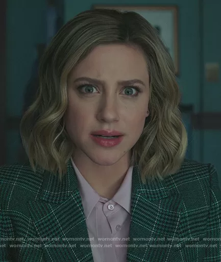 Betty Cooper (played by Lili Reinhart) on Riverdale on The CW was spotted wearing this green plaid blazer on Riverdale on episode 'Venomous' (6x14) in May 2022. Betty's Blazer is the Prince Of Wales Tailored Jacket by Maje.