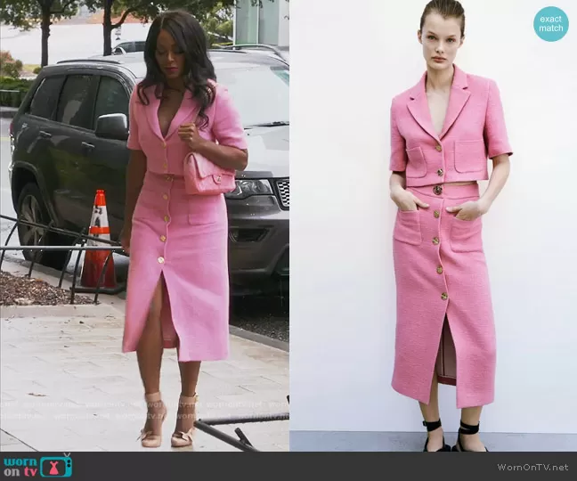 Kenya Moore on The Real Housewives of Atlanta on Bravo was spotted wearing this pink textured cropped jacket and skirt on The Real Housewives of Atlanta on episode 'The Tea Is Served' (14x03) in May 2022. Kenya's Jacket is the Pink Textured Jacket by Zara . Kenya's Skirt is the Pink Textured Skirt by Zara.
