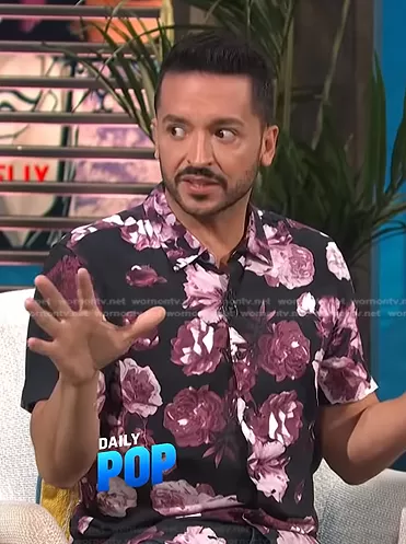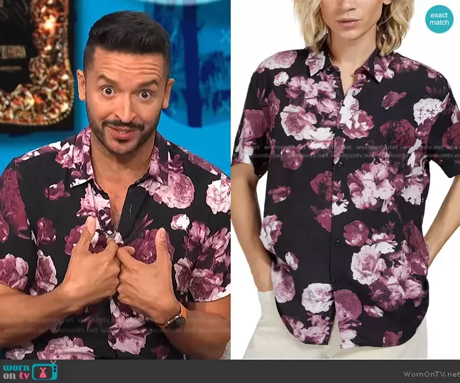on E! News on E! was spotted wearing this black floral shirt on E! News Daily Pop on Aug 03 2022's episode. 's Shirt is the Eco Blackout Floral Shirt by Guess.