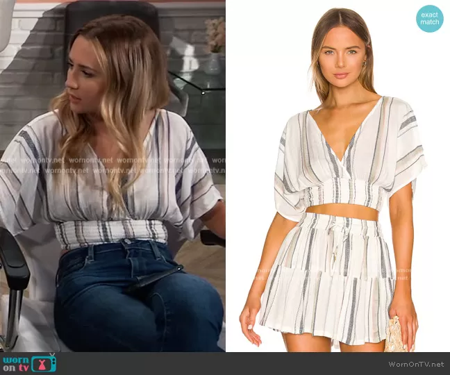 Josslyn Jacks (played by Eden McCoy) on General Hospital on ABC was spotted wearing this white striped cropped top on General Hospital on May 17 2022's episode. Josslyn's Top is the Amara Top by L*Space.