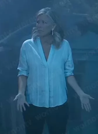 Carly Spencer (played by Laura Wright) on General Hospital on ABC was spotted wearing this light blue sheer stripe blouse on General Hospital on Sep 21 2022's episode. Carly's Top is the Drapey Stripe V Neck Blouse by Vince.