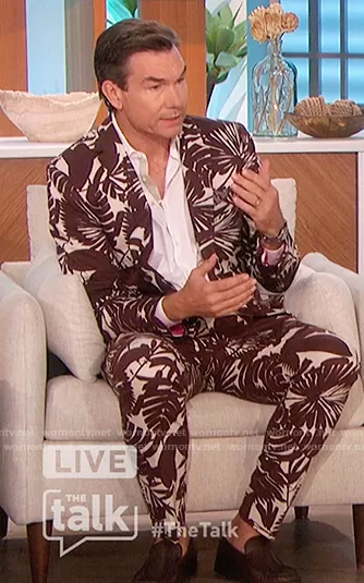 Jerry O'Connell on The Talk on CBS was spotted wearing this brown floral print blazer and pants on The Talk on May 16 2022's episode. Jerry's Blazer is the Thurston Blazer by Mr Turk . Jerry's Pants is the Clyde Slim Trousers by Mr Turk.