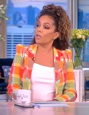 Sunny Hostin on The View on ABC was spotted wearing this plaid puff sleeve blazer on The View on May 17 2022's episode. Sunny's Blazer is the Plaid Puff Sleeve Cotton Blend Blazer by Smythe . Sunny's Pants is the Plaid Print Pintuck Crop Pants by Smythe.