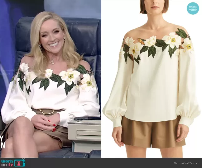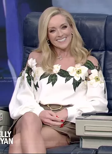 on Live with Kelly and Mark on Disney ABC Home Entertainment was spotted wearing this white floral blouse and khaki shorts on Live with Kelly and Ryan on May 17 2022's episode. 's Top is the Magnolia Illusion Neck Blouse by Oscar de la Renta . 's Shorts is the Pleated Wide-Leg Shorts by Oscar de la Renta.