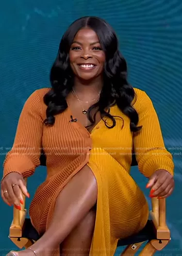 on Good Morning America on ABC was spotted wearing this yellow and brown colorblock ribbed dress on Good Morning America on May 17 2022's episode. 's Dress is the Shoko Dress by Staud.