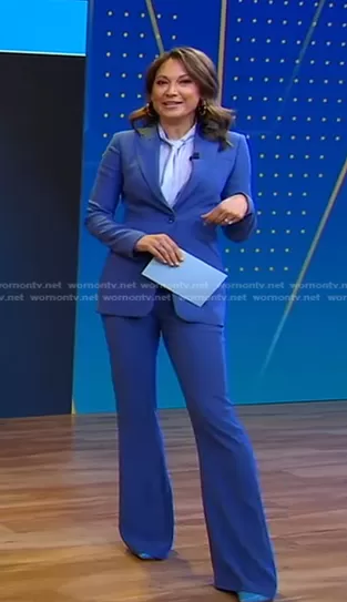 Ginger Zee on Good Morning America on ABC was spotted wearing this blue blazer and pants on Good Morning America on Jan 02 2023's episode. Ginger's Jacket is the Single Button Blazer by Elie Tahari . Ginger's Pants is the Fit & Flare Pants by Elie Tahari .