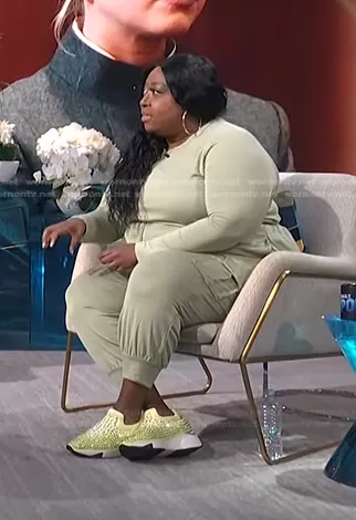 Loni Love on E! News on E! was spotted wearing this light green drawstring jumpsuit on E! News Daily Pop on May 17 2022's episode. Loni's Jumpsuit is the Trendy Plus Size French Terry Jumpsuit by Nina Parker.