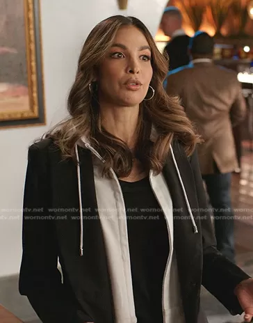 (played by ) on Dynasty on The CW was spotted wearing this white hoodie and black blazer on Dynasty on episode 'I'll Settle for a Prayer' (5x11) in May 2022. 's Sweater is the Hoodie Dickey by Veronica Beard . 's Jacket is the Classic Jacket by Veronica Beard.