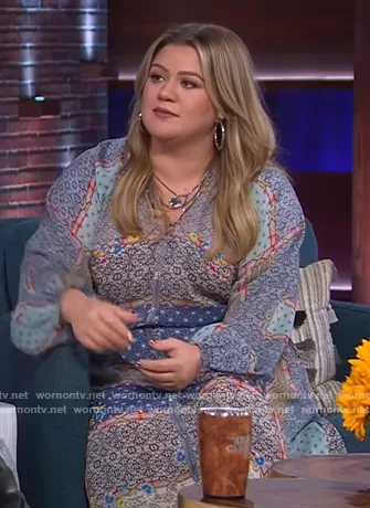 Kelly Clarkson on The Kelly Clarkson Show on NBC was spotted wearing this blue patchwork print maxi dress on The Kelly Clarkson Show on May 18 2022's episode. Kelly's Dress is the Kichica Aphrodite Dress by Johnny Was.
