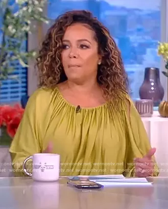 Sunny Hostin on The View on ABC was spotted wearing this green off shoulder asymmetric dress on The View on May 18 2022's episode. Sunny's Dress is the One-shoulder asymmetric stretch-satin twill midi dress by Alexandre Vauthier.