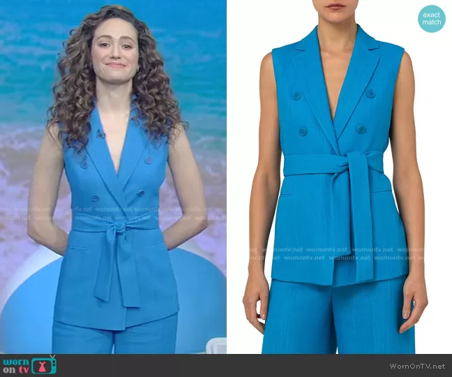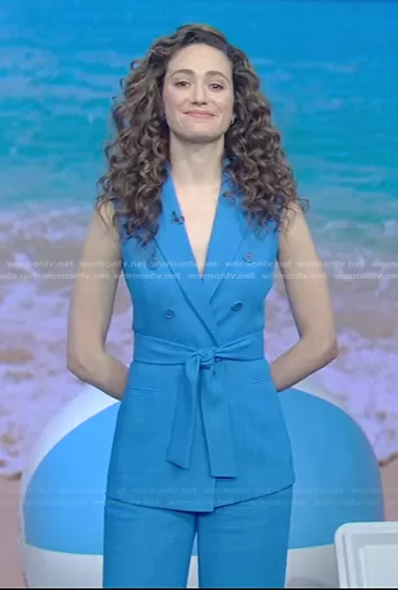 on Live with Kelly and Mark on Disney ABC Home Entertainment was spotted wearing this blue sleeveless blazer and pants on Live with Kelly and Ryan on May 19 2022's episode. 's Vest is the Tailored Tie-Waist Vest by Akris . 's Pants is the Flair Linen & Virgin Wool Crepe Pants by Akris.