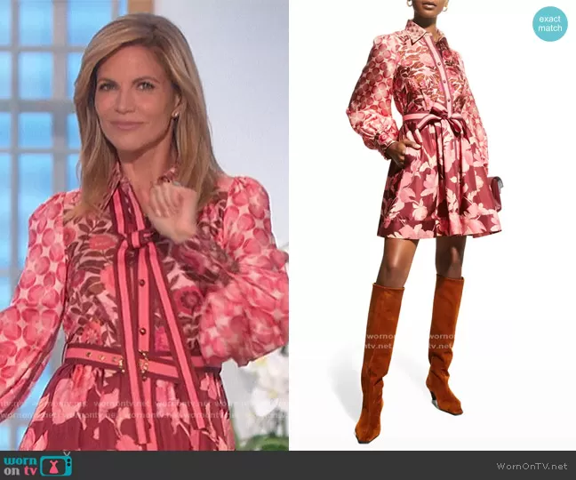 Natalie Morales on The Talk on CBS was spotted wearing this red floral printed mini dress on The Talk on May 19 2022's episode. Natalie's Dress is the Concert Spliced Mini Shirtdress by Zimmermann.