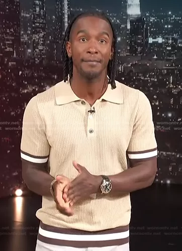 Scott Evans on Access Hollywood on NBC was spotted wearing this beige striped trim polo shirt on Access Hollywood on May 19 2022's episode. Scott's Shirt is the Quinn Polo Shirt by Che.
