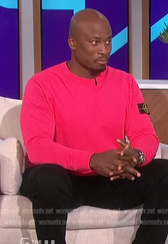 Akbar Gbajabiamila on The Talk on CBS was spotted wearing this pink sweatshirt on The Talk on May 20 2022's episode. Akbar's Sweater is the Compass-patch sweatshirt by Stone Island.