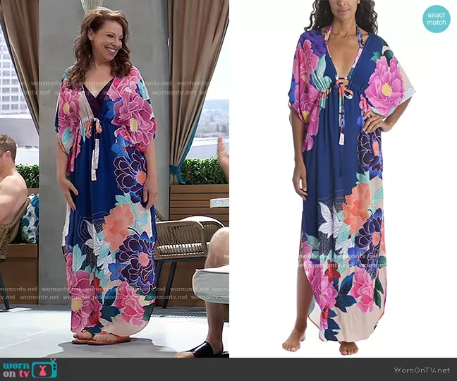 Liesl Obrecht (played by Kathleen Gati) on General Hospital on ABC was spotted wearing this blue floral kaftan dress on General Hospital on May 19 2022's episode. Liesl's Dress is the Maxi Caftan Swimsuit Coverup by Trina Turk.