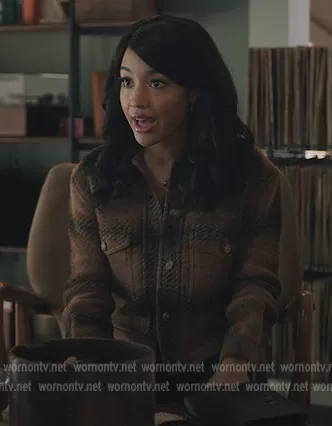 (played by ) on Riverdale on The CW was spotted wearing this brown plaid jacket on Riverdale on episode 'Things That Go Bump in the Night' (6x15) in May 2022. 's Jacket is the Autumn Shirt Jacket by Wilfred by Aritzia.
