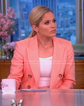 Sara Haines on The View on ABC was spotted wearing this pink double breasted blazer and shorts on The View on May 23 2022's episode. Sara's Jacket is the Gaya Linen Dickey Jacket by Veronica Beard . Sara's Shorts is the Ashford Linen Blend Shorts by Veronica Beard.