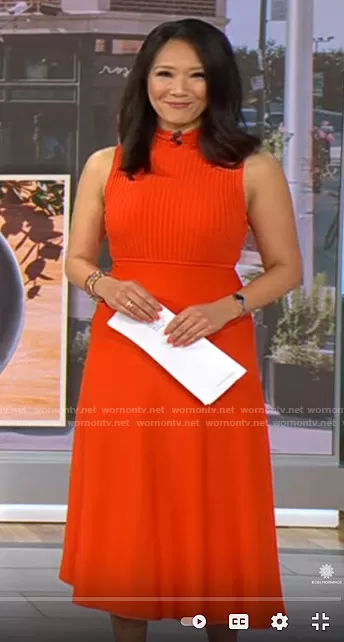 Nancy Chen on CBS Mornings on CBS was spotted wearing this orange ribbed sleeveless dress on CBS Mornings on May 21 2022's episode. Nancy's Dress is the Compact Rib Sweater Dress by Theory .