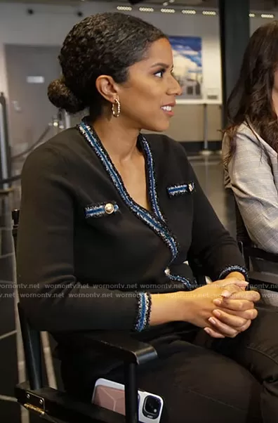 Adriana Diaz on CBS Mornings on CBS was spotted wearing this black fringed trim cardigan on CBS Mornings on May 23 2022's episode. Adriana's Sweater is the Myster Cardigan by Maje.