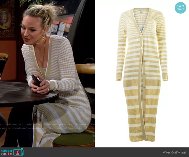 Sharon Newman (played by Sharon Case) on The Young and the Restless on CBS was spotted wearing this long striped cardigan on The Young and the Restless on May 24 2022's episode. Sharon's Sweater is the Ombre Striped Ribbed Cardigan in Dune/Bleach White by Autumn Cashmere.