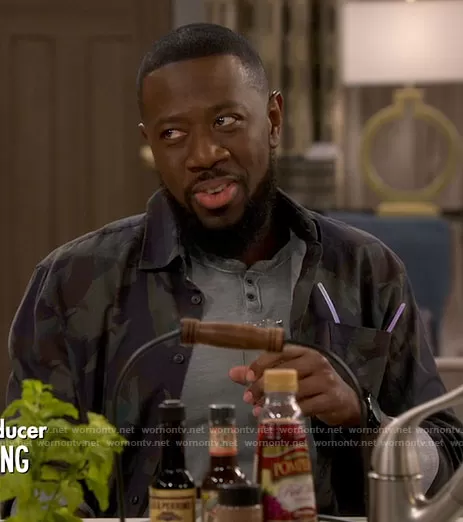 Malcom (played by Sheaun McKinney) on The Neighborhood on CBS was spotted wearing this camo print shirt on The Neighborhood on episode 'Welcome to the Ring' (4x22) in May 2022. Malcolm's Shirt is the Fielder Camo Print Shirt by Ted Baker.