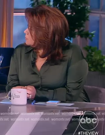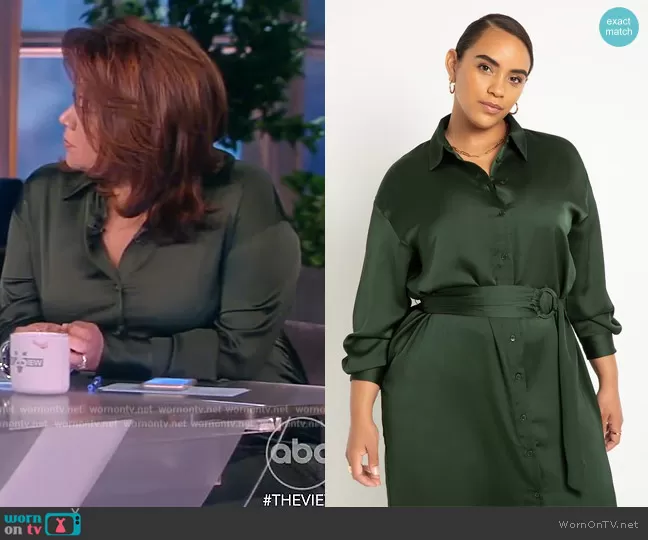 Ana Navarro on The View on ABC was spotted wearing this green satin shirtdress on The View on May 25 2022's episode. Ana's Dress is the Satin Button Down Maxi Shirtdress by Eloquii.