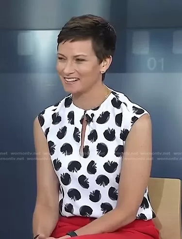 Stephanie Gosk on Today on NBC was spotted wearing this white printed keyhole top on Today on Aug 11 2023's episode. Stephanie's Top is the Itino Top by Hugo Boss.