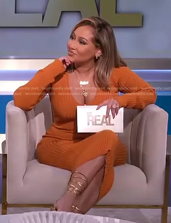 Adrienne Houghton on The Real on BETher was spotted wearing this orange ribbed v-neck dress on The Real on May 25 2022's episode. Adrienne's Dress is the Bekah Deep V Midi Dress by NBD.