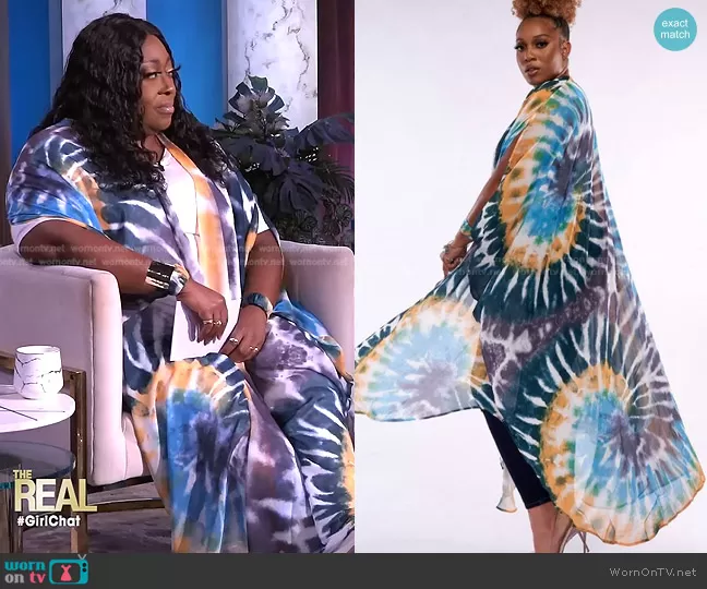 Loni Love on The Real on BETher was spotted wearing this tie dye kimono jacket on The Real on May 25 2022's episode. Loni's Coverup is the Tie Dye Coverup by Eleven 60.