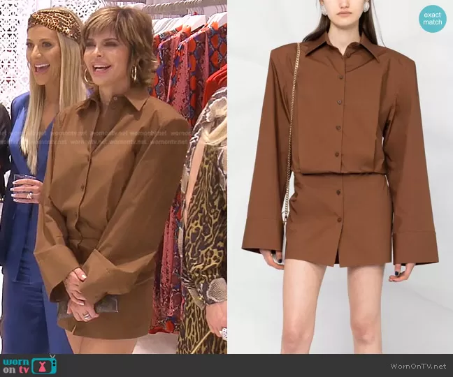 Lisa Rinna on The Real Housewives of Beverly Hills on Bravo was spotted wearing this brown mini shirtdress on The Real Housewives of Beverly Hills on episode 'There's Sutton about Crystal' (12x03) in May 2022. Lisa's Dress is the Wide-Sleeve Cotton Shirt Dress by The Attico.