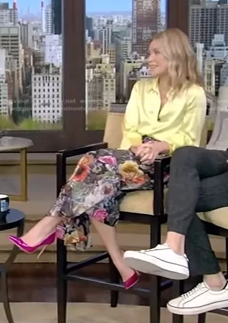 Kelly Ripa on Live with Kelly and Mark on Disney ABC Home Entertainment was spotted wearing this floral midi skirt and metallic pumps on Live with Kelly and Ryan on May 26 2022's episode. Kelly's Skirt is the Button Down A Line Skirt by Adam Lippes . Kelly's Shoes is the Mirror Calfskin Stiletto Pumps by Gianvito Rossi.