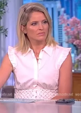 Sara Haines on The View on ABC was spotted wearing this white ruffle top on The View on May 26 2022's episode. Sara's Top is the Andrea Top by Ramy Brook.