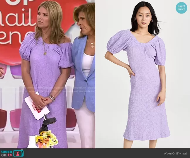 Jenna Bush Hager on Today on NBC was spotted wearing this lilac puff sleeve dress on Today on Aug 30 2022's episode. Jenna's Dress is the Garance Smocked Dress Stine Goya.