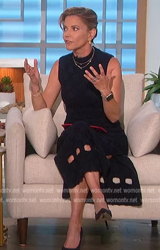 Natalie Morales on The Talk on CBS was spotted wearing this navy sleeveless check dress on The Talk on May 26 2022's episode. Natalie's Dress is the Glacier Sleeveless Mock Neck Sweater Dress by Staud.