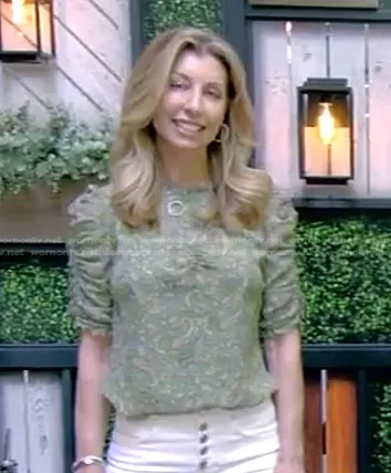 on Live with Kelly and Mark on Disney ABC Home Entertainment was spotted wearing this green print ruched top on Live with Kelly and Ryan on May 27 2022's episode. 's Top is the Paisley Long Sleeve Silk Blouse by Veronica Beard.
