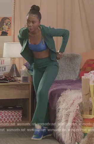 Keisha (played by Netta Walker) on All American Homecoming on CWTV was spotted wearing this green ribbed cardigan and pants on All American Homecoming on episode 'Love and War' (1x03) in Mar 2022. Keisha's Sweater is the Glennon Cardigan by Callahan . Keisha's Pants is the Trish Pant by Callahan.