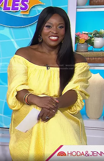 on Today on NBC was spotted wearing this yellow off the shoulder dress on Today on May 30 2022's episode. 's Dress is the Cassian Off The Shoulder Cutout Dress by ASTR The Label.