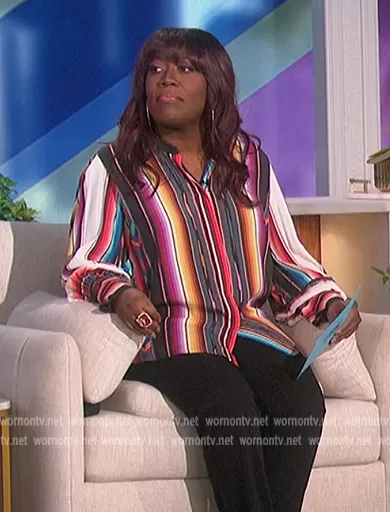 Sheryl Underwood on The Talk on CBS was spotted wearing this multicolored stripe blouse on The Talk on May 30 2022's episode. Sheryl's Top is the Felina Chevron Stripe Blouse by Kobi Halperin.