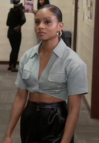 Simone (played by Geffri Hightower) on All American Homecoming on CWTV was spotted wearing this crop top and leather skirt on All American Homecoming on episode 'Move On' (1x10) in May 2022. Simone's Top is the The Chrisa Crop Blouse by L'Academie . Simone's Skirt is the Conry Cuffed Leather Shorts by Alice and Olivia.