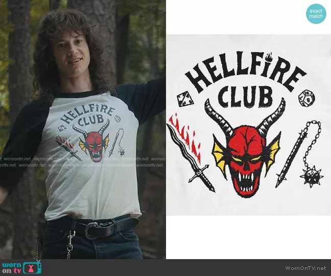 (played by ) on Stranger Things on Netflix was spotted wearing this Hellfire Club tee on Stranger Things on episode 'Chapter Eight: Papa' (4x08) in Jul 2022. 's Shirt is the Hellfire Club Raglan T-Shirt designed by Trevor Girard at Beholder.