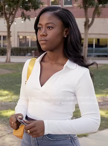 (played by ) on All American Homecoming on CWTV was spotted wearing this White polo long sleeve top on All American Homecoming on episode 'Move On' (1x10) in May 2022. 's Top is the Long-Sleeve Ribbed Polo Top by Abercrombie.